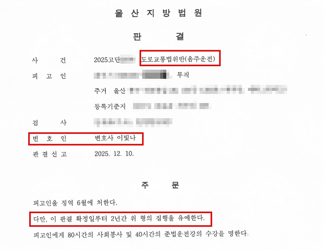 그 결과, 처단형의 하한인 징역 6월에 집행유예 2년, 사회봉사 80시간 및 준법운전강의 40시간 수강의 선처를 이끌어 낼 수 있었습니다.